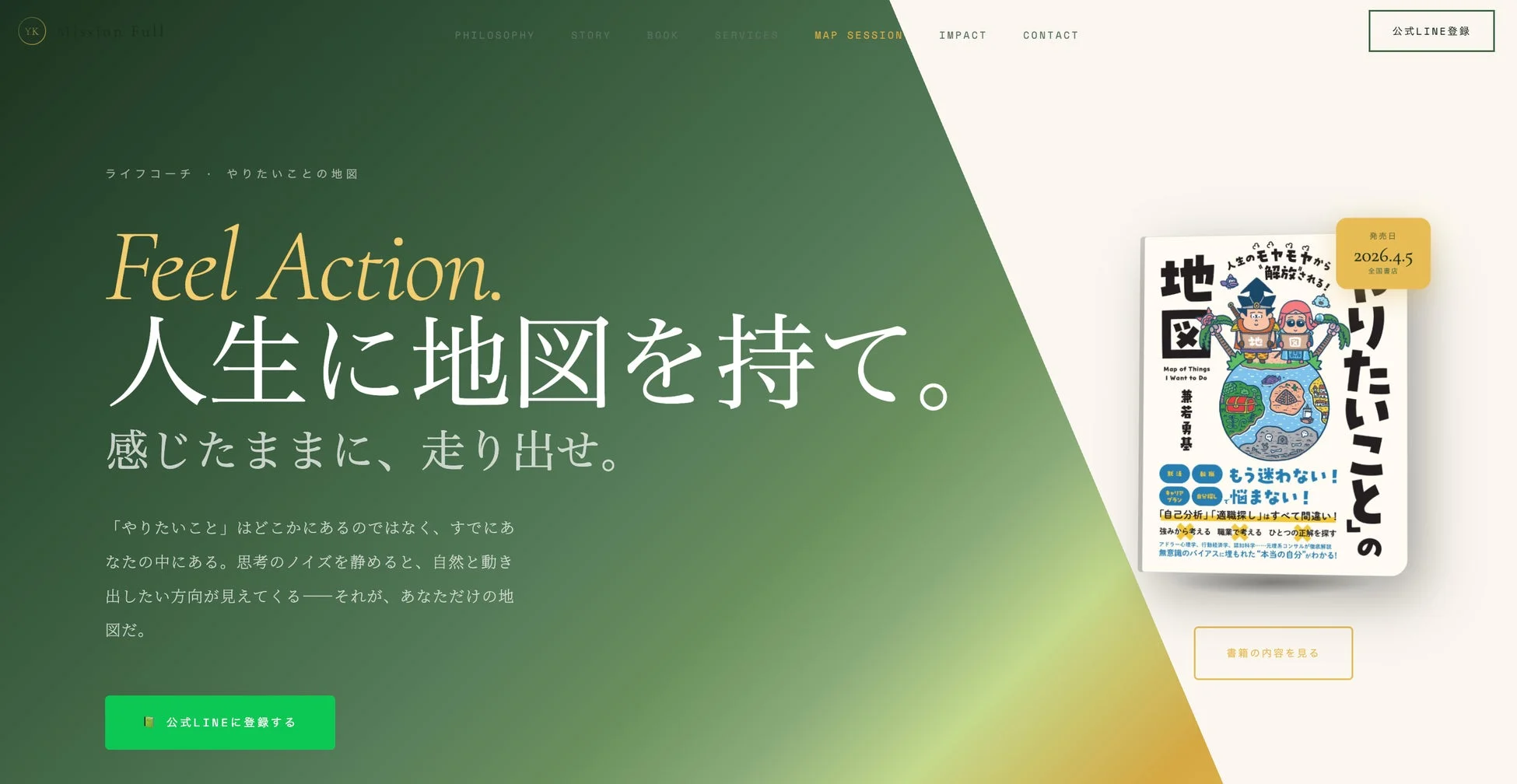 兼若氏は、「本が届くだけでは、人は変わらない」という1500名以上のコーチング実践から得た確信を持っています。書籍を読んで気づきを得た人が、次の行動へ移せる場所が必要だと考え、公式サイトは単なる情報ページではなく、「人生の地図を描くための入口」として設計されました。