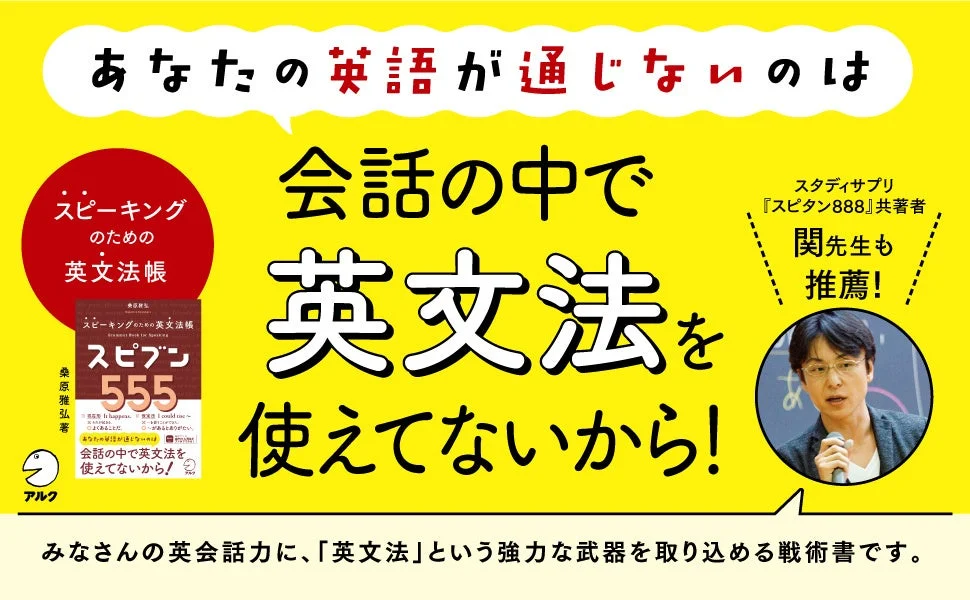 この本は、「英会話に必要な英文法を、英会話に必要な側面からとらえ直す」というコンセプトで作られています。英会話に本当に役立つ文法項目だけを厳選し、わかりやすい解説と555個もの実践例文で、文法の知識を「話せる力」へとスムーズにつなげてくれます。大好評だった『スピタン888』の姉妹編なんですよ!
