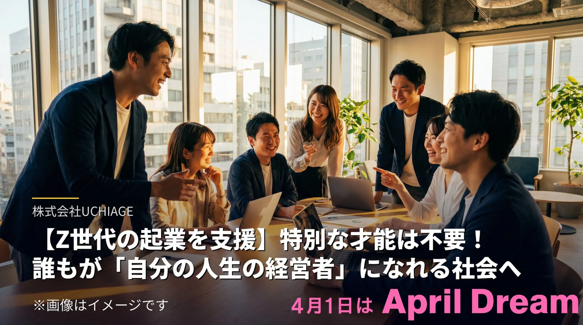 株式会社UCHIAGEは、2026年4月1日の「April Dream」プロジェクトにおいて、Z世代の起業を支援し、誰もが「自分の人生の経営者」になれる社会の実現、そして「キャリアオーナーシップの完全普及」を夢として発表しました。この夢を支えるのが、『チームビルディング道』の確立です。