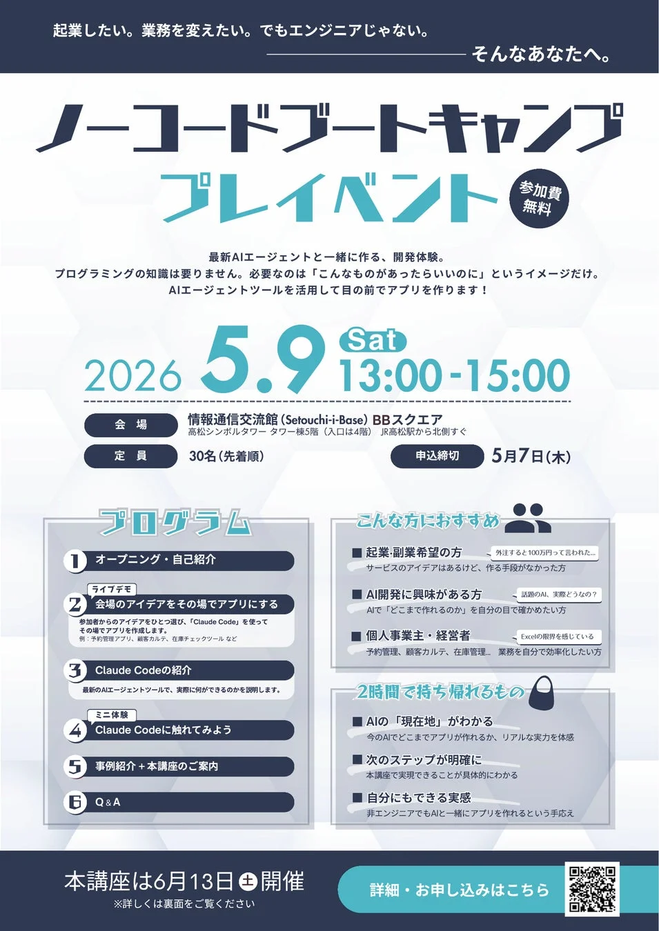 株式会社AppTalentHub(ATH)は、情報通信交流館(Setouchi-i-Base)主催のもと、2026年5月9日(土)にAIエージェント「Claude Code」を使ったアプリ開発体験イベントを実施します。これは、2026年6月開講予定の「ノーコードブートキャンプ」に先駆けたプレイベントです。