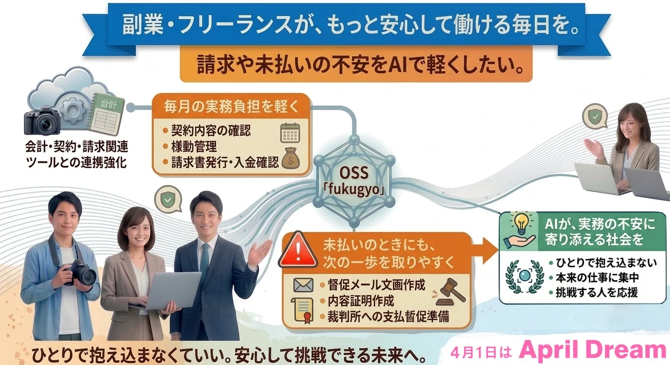 副業やフリーランスとして活躍する皆さんが、請求や未払いの不安に悩まされず、本来の仕事や挑戦に集中できる未来が、この「fukugyo」によってきっと近づくでしょう。