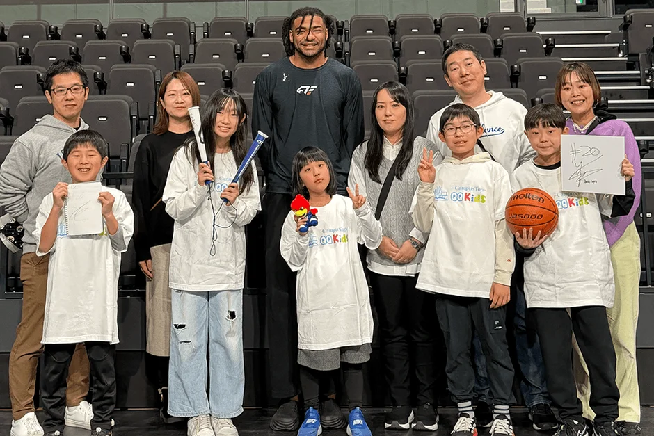 イベントは豊田合成記念体育館(エントリオ/愛知県稲沢市)で開催され、QQEnglishの子ども向けオンライン英会話サービス「QQキッズ」の受講生やアンバサダーを含む、7歳から12歳までの5名の子どもたちが参加しました。試合観戦後、子どもたちは海外出身のプロ選手に英語でインタビューするという、普段なかなかできない貴重な機会に挑戦しました。