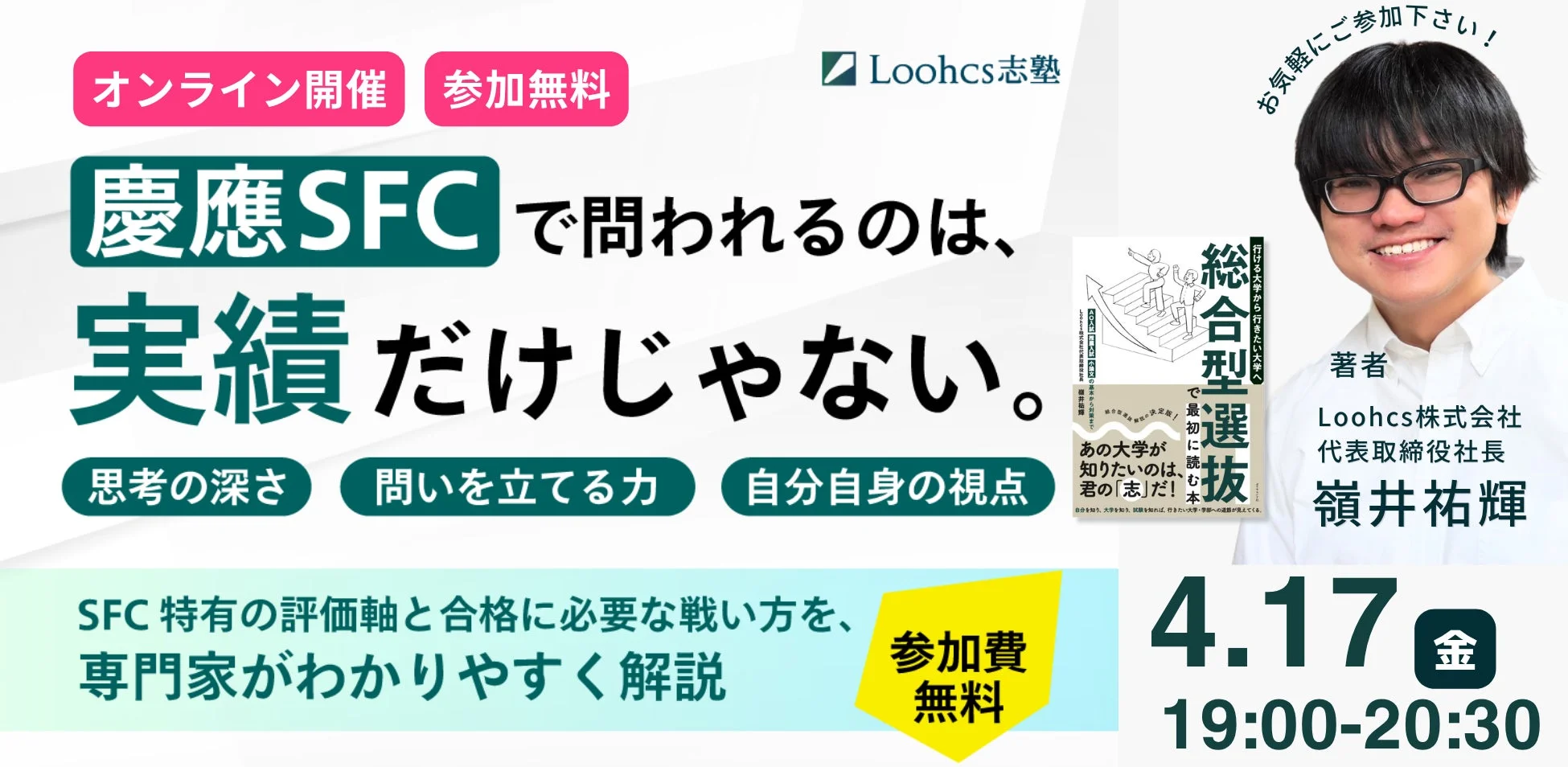 SFC合格者を多数輩出してきたルークス志塾の代表、嶺井祐輝氏が登壇し、SFC特有の評価軸や合格に必要な思考力、志望理由書・小論文対策の考え方などをわかりやすく解説してくれますよ。