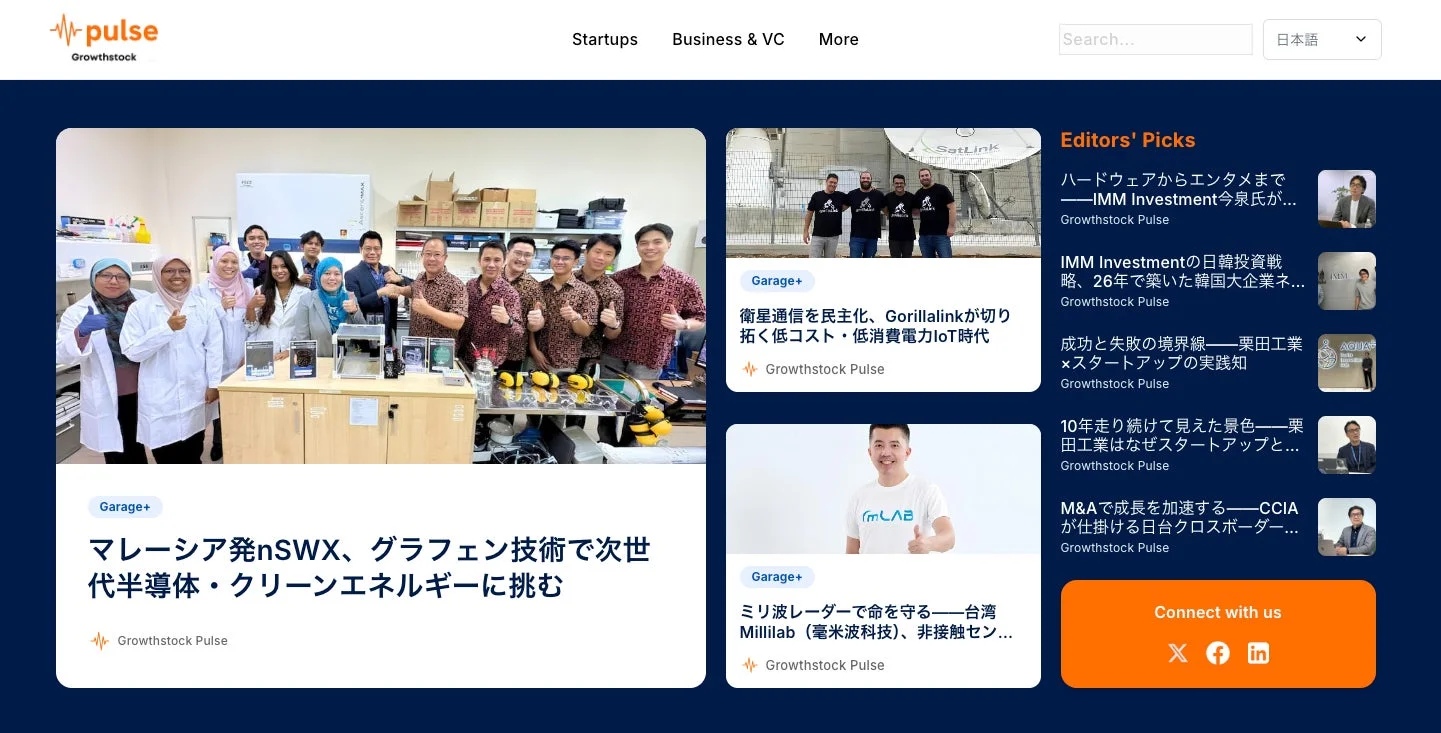 Growthstock Pulseは、日本やアジアを舞台に活躍するスタートアップのリアルな挑戦と課題に光を当てる多言語オンラインメディアです。英語と日本語の二言語で展開し、国境を越えた取り組みを世界へ発信しています。