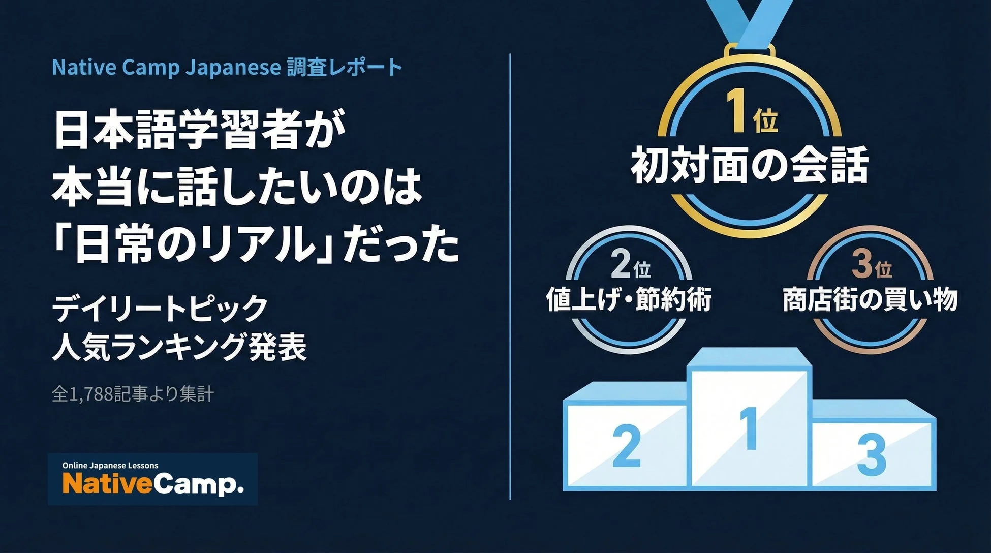 今回のランキングは、2026年4月14日時点のデイリートピック全1788記事を対象に、Native Camp Japanese内の受講データと閲覧数をもとに独自に集計されました。
