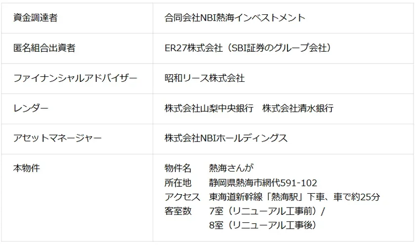 旅館などの宿泊施設への投資を通じて地方創生に取り組むNBIホールディングスと、金融・投資分野で豊富なノウハウを持つSBI証券が協力し、「熱海さんが」をより魅力的な場所にしていきます。さらに、昭和リース株式会社がファイナンシャルアドバイザーとしてこのプロジェクトをサポートしています。