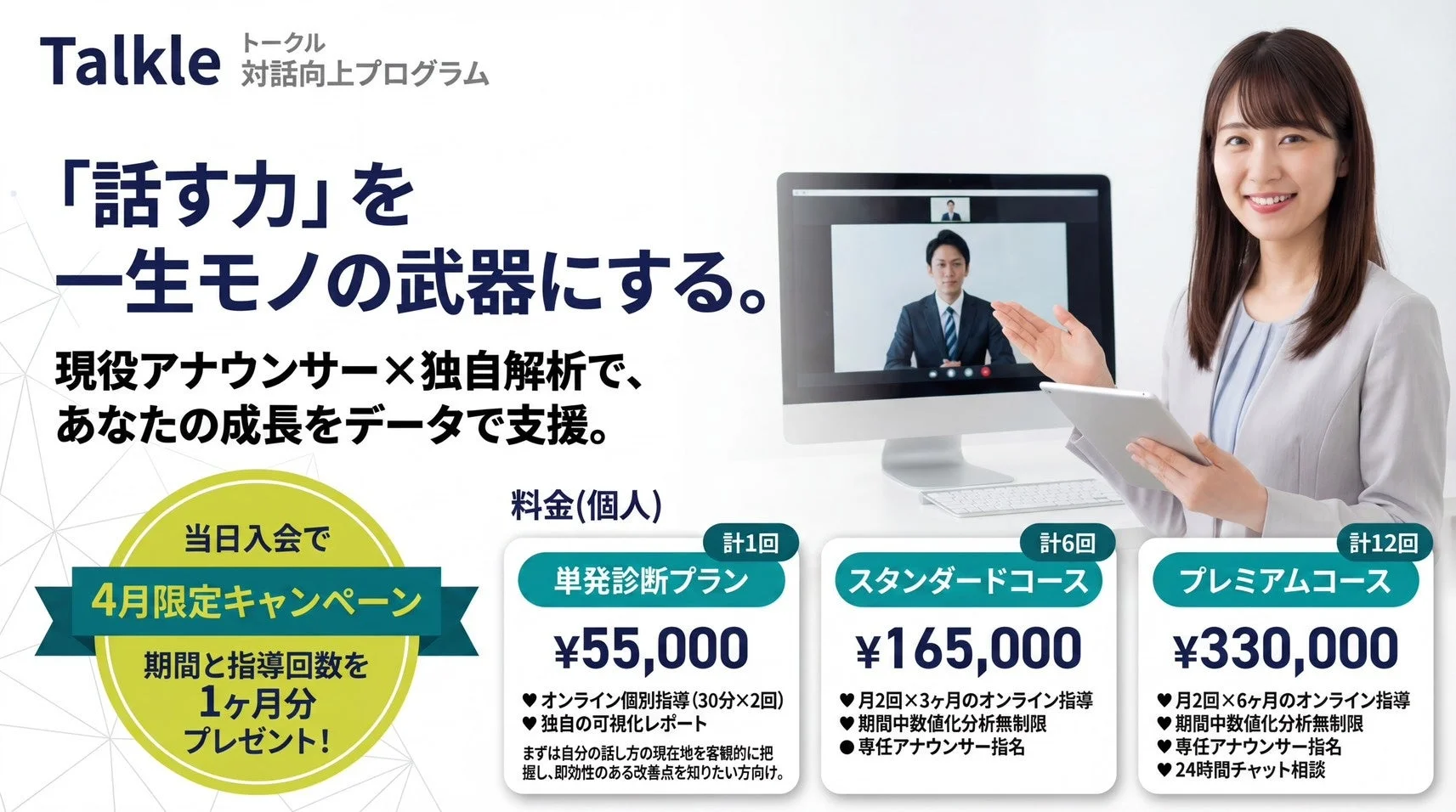 これまで現役アナウンサーによる対面指導で「伝える力」をサポートしてきたTalkleですが、今回、独自のデータ解析による「可視化レポート」を正式導入しました。これにより、感覚的なフィードバックだけでなく、客観的な数値で自身の課題や魅力を具体的に把握できるようになり、より確かな成長を実感できるプログラムへと進化しています。