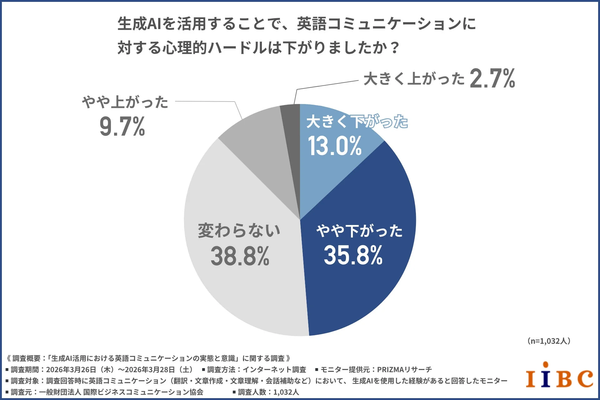 生成AIの活用によって、英語コミュニケーションに対する心理的なハードルが「下がった」と感じている人が、全体の約半数(48.8%)もいることが分かりました。