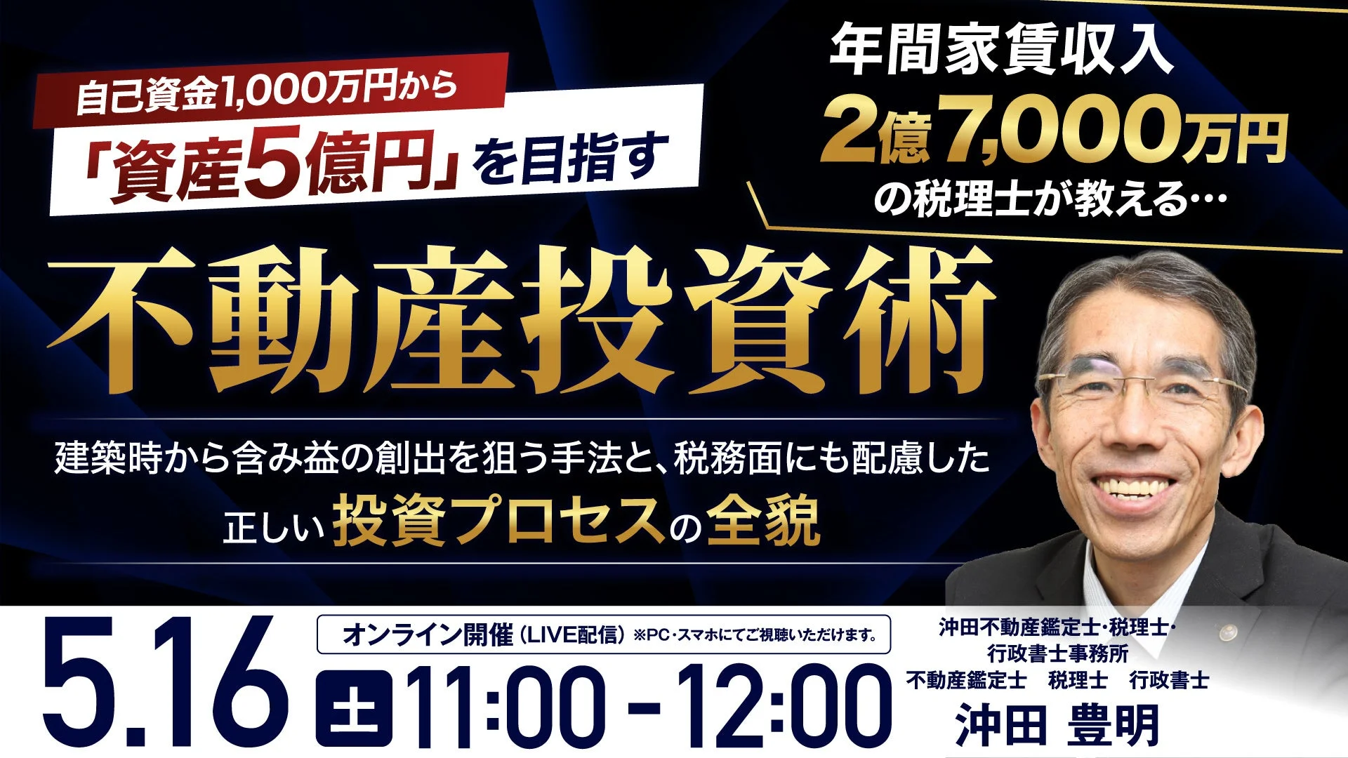 不動産投資で着実に資産を築くためには、単に物件を購入するだけでなく、投資家自身が「利益の源泉」を理解し、それをコントロールする能力が不可欠です。本セミナーでは、年間家賃収入約2億7,000万円を達成した実績を持つ沖田豊明氏が、「5億円の資産形成に向けた正しい不動産投資術」を伝授します。
