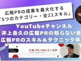 広報PRコンサルタントとして人気の井上岳久氏が運営するYouTubeチャンネル「井上岳久の広報PRの知らない世界」が、開設8ヶ月を記念して、広報ノウハウを体系化した「広報PRスキル&テクニック早見表」を公開しました。視聴者からの「体系的に学びたい」という声に応え、現場で役立つスキルを5つのカテゴリー、21のテクニックに整理しています。