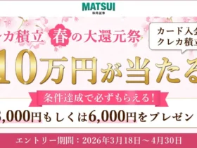 松井証券が「クレカ積立 春の大還元祭」キャンペーンを開催します。JCBオリジナルシリーズに新規入会し、クレカ積立で3万円以上の投資信託を買付すると、参加者全員に最大6,000円、さらに抽選で最大10万円がプレゼントされます。新生活を機に資産形成を始めたい方には見逃せないチャンスです!