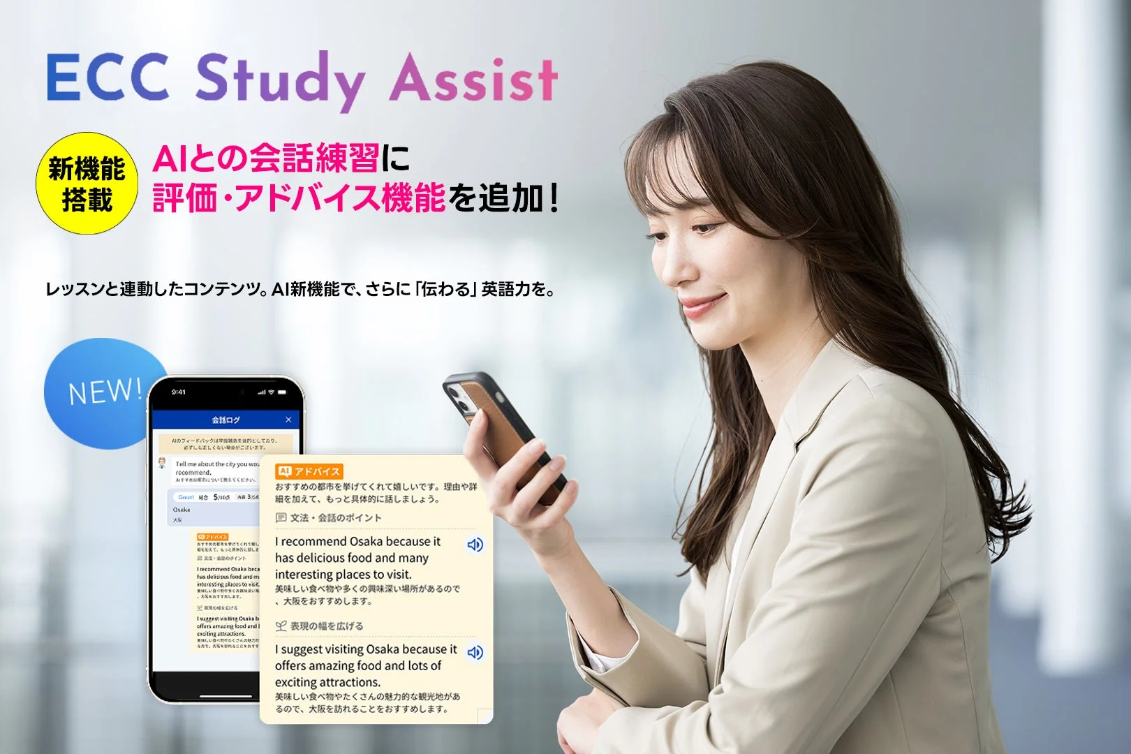 総合教育・生涯学習機関の株式会社ECCが運営するECC外語学院は、学習支援アプリ「ECC Study Assist」に、2026年4月1日(水)から「AI評価・アドバイス機能」を新たに搭載します。この新機能は、AIが発話内容をスコア化して評価し、さらに改善のためのアドバイスを提供してくれるというもの。これにより、英会話練習の質がぐっと高まり、学習効果のさらなる向上が期待されます。