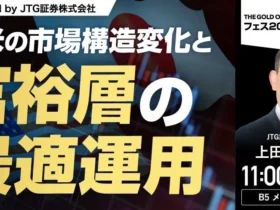 2026年3月14日に東京国際フォーラムで開催される「THE GOLD ONLINE フェス 2026」にて、JTG証券株式会社の上田祐介氏が『日米の市場構造変化と富裕層の最適運用』をテーマにセミナーに登壇します。無料で参加できるこのフェスで、資産運用や投資の最新情報をキャッチし、あなたの資産を守り、増やすヒントを見つけましょう!