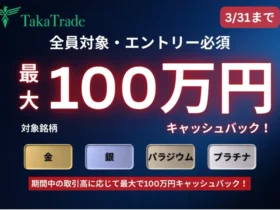 投資プラットフォーム「TakaTrade」が、サービス開始から半年で顧客全体の売買損益が通算プラスを記録しました。これを記念して、貴金属キャッシュバックとPostPrime連動の2つの特大キャンペーンを期間限定で実施します。