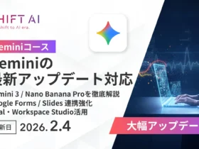 株式会社SHIFT AIが法人向けリスキリングサービス「SHIFT AI for Biz」の「Geminiコース」を2026年2月4日に大幅にアップデートしました。最新のGemini 3やNano Banana Proに対応し、Google Workspace連携やOpal・Workspace Studio活用など、実務で役立つ実践的なカリキュラムが満載です。