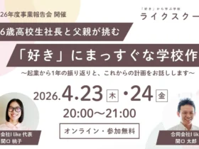 不登校を経験した16歳の高校生社長・関口桃子さんとその父親が立ち上げた合同会社I likeが、設立一周年を記念してオンライン事業報告会を開催します。この1年間の活動と、船橋市での「ライクスクール」開校に向けた計画が発表されます。