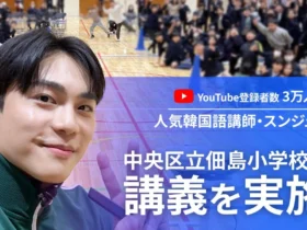オンライン韓国語スクールK-PROの代表スンジュンさんが、中央区立佃島小学校で小学3~6年生500人に韓国語の特別講義を行いました。ジャンケンやクイズを交え、日常生活のフレーズや韓国文化に触れる楽しい授業で、子どもたちは異文化理解の魅力を体験しました。