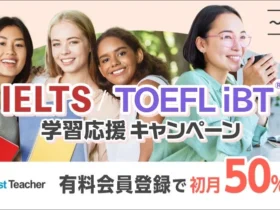 オンライン英会話「ベストティーチャー」が、IDP Education JapanとETS Japanと共同で、IELTSおよびTOEFL iBT®の学習応援キャンペーンを実施します。期間中に新規有料会員になると、初月受講料が半額になり、さらに抽選で公式模試がもらえるチャンス! 英語学習を始めるなら今がチャンスです。