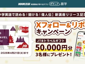 NHK英語講座を気軽に学べるアプリ「ポケット語学」が、新講座「Enjoy Simple English Readers」のリリースを記念して、X(旧Twitter)で豪華プレゼントキャンペーンを実施中です。5万円分のJTBトラベルギフトが当たるチャンスをお見逃しなく!