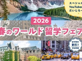 2026年4月に東京と名古屋で開催される「春のワールド留学フェア2026」は、世界16ヵ国53校の学校担当者と直接話せるチャンス!人気YouTuberだいじろーさんの特別トークや、留学費用割引特典も用意されています。入場無料・事前予約制なので、留学を考えている方はぜひチェックしてください!