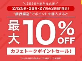 日本最大級のオンライン習い事サイト「カフェトーク」が、2026年2月25日から27日までの3日間限定で、銀行振込によるポイント購入を対象とした特別割引セールを実施します。通常よりも少ない5,000ポイントから割引が適用され、最大10%OFFでお得にレッスンを始められるチャンスです!