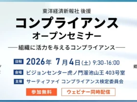 2026年7月4日(土)に、郷原信郎氏と大久保和孝氏が登壇する「2026年度夏期コンプライアンスオープンセミナー」が開催されます。東京会場とオンラインのハイブリッド形式で、参加費は無料!ビジネスパーソンが今知るべきコンプライアンスのトピックが満載です。