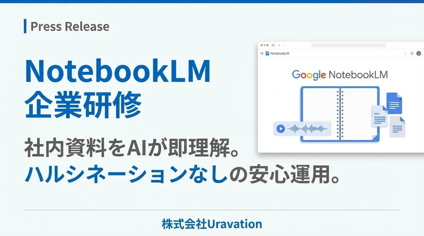 株式会社Uravationが、GoogleのAIリサーチツール「NotebookLM」に特化した企業向け研修サービスを2026年4月から始めるよ!NotebookLMは、アップロードした資料の範囲内でしか回答しないから、よくある「ハルシネーション(事実と違うことをAIが言っちゃうこと)」の心配がほとんどないんだって。