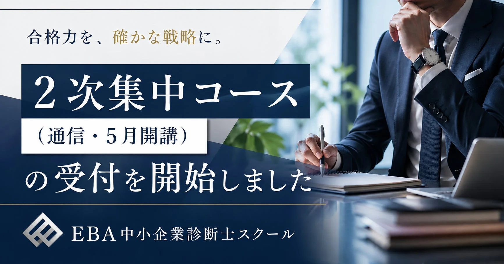 2026年10月25日(日)に実施される令和8年度の中小企業診断士2次試験(筆記)に向けて、EBA中小企業診断士スクールが通信制の「2次集中コース(5月開講)」の受付をスタートしました。