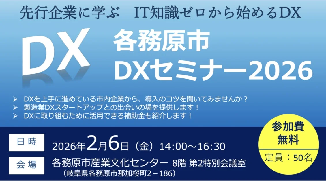 「各務原市 DXセミナー2026」は、「先行企業に学ぶ IT知識ゼロから始めるDX」をテーマに掲げ、DXの具体的な進め方や実践事例を共有することを目指しています。これからDXに取り組みたい企業や、どのように進めたら良いか悩んでいる企業にとって、実践的なヒントが得られる場となるでしょう。