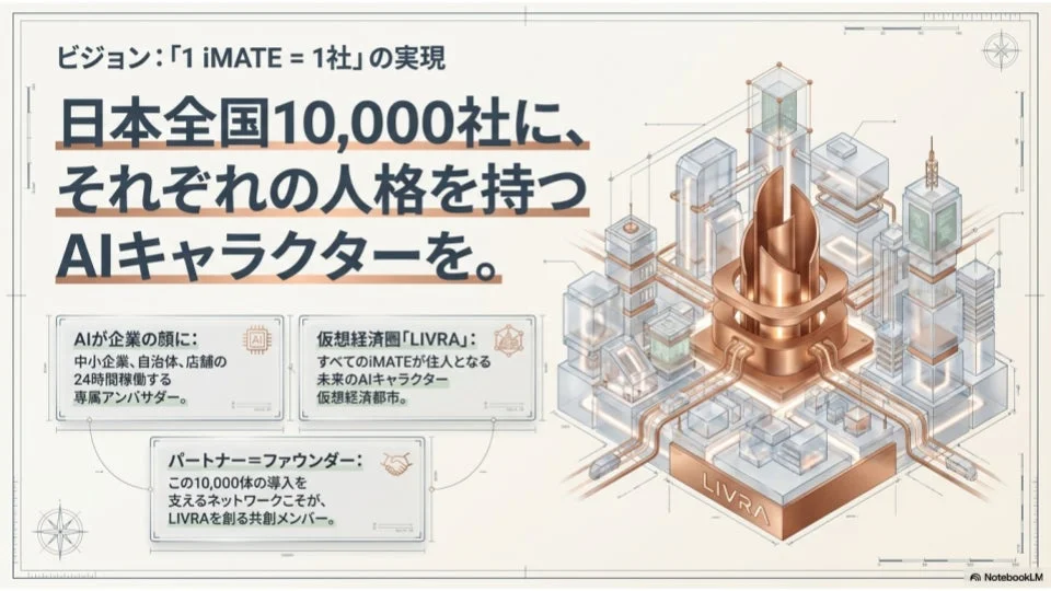 Nyagsicは、「1社1体のiMATE」という壮大なビジョンを掲げています。これは、日本全国10,000社それぞれが独自のAIキャラクターを持ち、仮想経済圏「LIVRA」の住人となる世界を目指すもの。このビジョンを実現するためには、全国各地で活躍するパートナーの力が必要不可欠なんです。