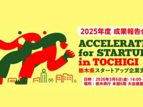 栃木県とAlphaDriveが主催する「令和7年度 栃木県スタートアップ企業支援事業 成果報告会」が、2026年3月6日に開催されます。県内スタートアップ9者によるピッチや、ベータ・ベンチャーキャピタル田村直哉氏による資金調達の特別講演が行われる、起業を目指す人必見のイベントです。