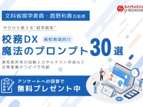 株式会社SAMURAIが、文部科学省視学委員監修のもと、高校教員の日常業務をAIで効率化する「校務DX魔法のプロンプト30選」を無償で提供します。通知表所見や小テスト作成など、30種類の業務がコピペで簡単に完結し、先生方の負担軽減をサポートします。